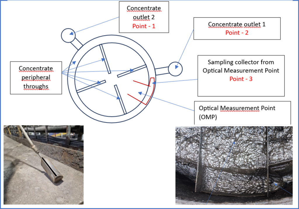 For this purpose the team performed the series of detailed tests on the stability of Cu content in the Flotation Machine MF-202 destined for the Pilot process and analyzed their results. The schematic view of flotation cell with 3 Points of froth sampling is presented in Fig.2  below.