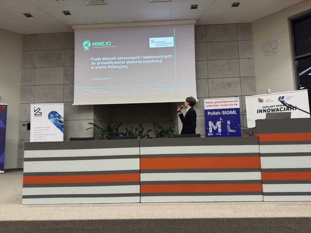 The talk showcased the results of research and development conducted within task T3.4 “Artificial Intelligence technology for monitoring, control of metal ore processing” of the Mine.io project, carried out by a Mine.io team including Łukasiewicz – AI, Łukasiewicz – ITR, KGHM, and AGH.