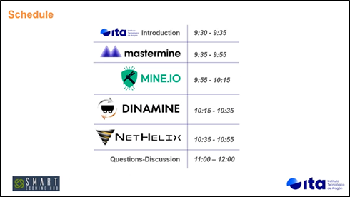 On April 10th, 2025, the second online workshop in the Smart EcoMine Hub cluster was held. Representatives from the four sister projects in the cluster (MASTERMINE, DINAMINE, NETHELIX and MINE.IO) gathered to present and discuss on standardisation activities since the previous workshop in September 2024 (summary available at https://mineio-horizon.eu/meeting-on-standardisation-within-the-smart-ecomine-hub/).